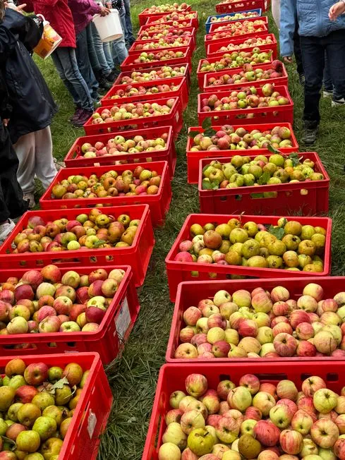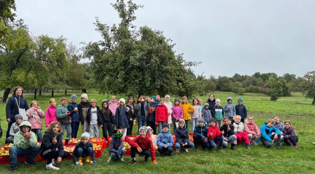 111 Schülerinnen und Schüler der Grund- und Mittelschule Dombühl machten sich in der vergangenen Woche mit viel Eifer auf den Weg zur Apfelernte. Auf den Obstwiesen der Familie Hezner sowie auf Bäumen in Weißenkirchberg durfte fleißig gesammelt werden. Darunter auch der sehr ergiebige Baum von Irmgard Vogel, den wir ebenfalls plündern durften. Das Ergebnis konnte sich sehen lassen: Über 650 Kilogramm Äpfel kamen zusammen, die anschließend im „Safthäusle“ in Schnelldorf zu mehr als 400 Litern Apfelsaft gepresst wurden.
