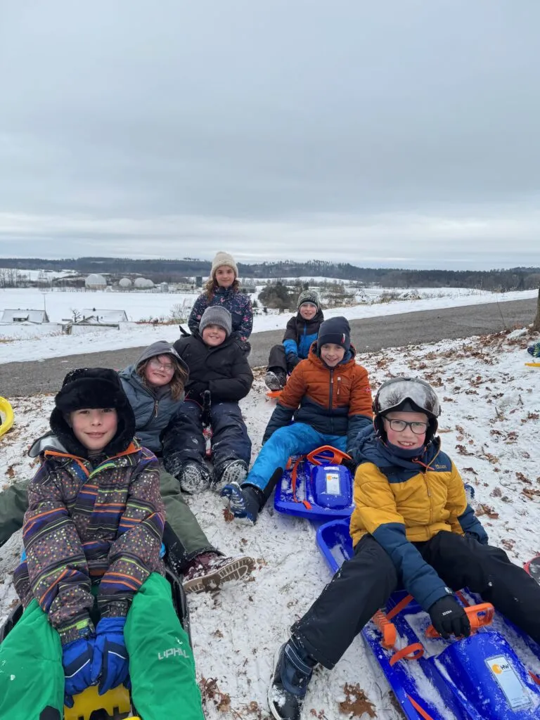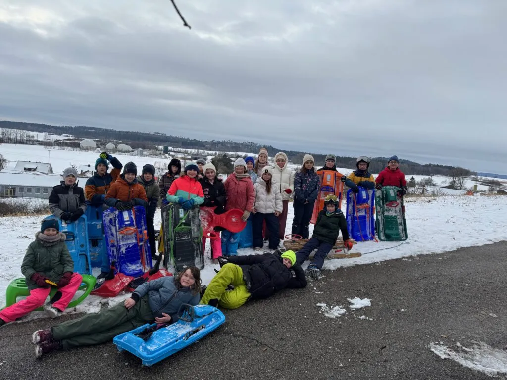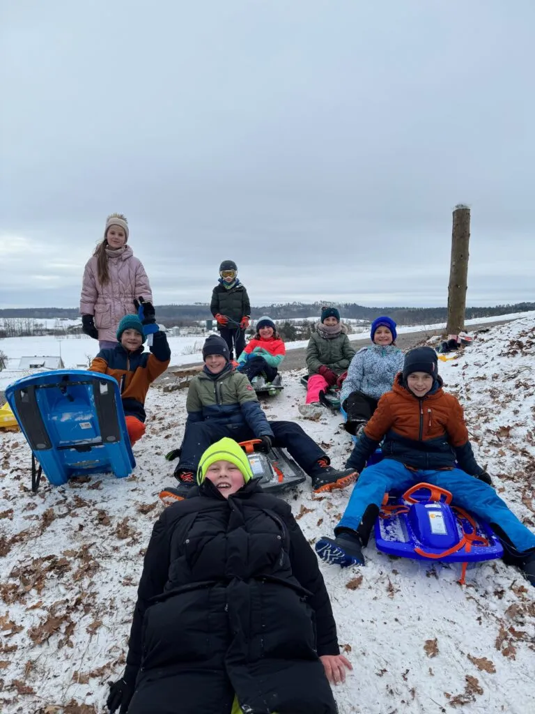 Warm eingepackt, mit Schlitten unterm Arm und einem breiten Grinsen im Gesicht zogen die 4. Klassen zum Kirchbuck. Denn: Heute hieß es nicht Rechnen, Schreiben oder Lesen – sondern Rutschen, Lachen und Schnee im Gesicht!